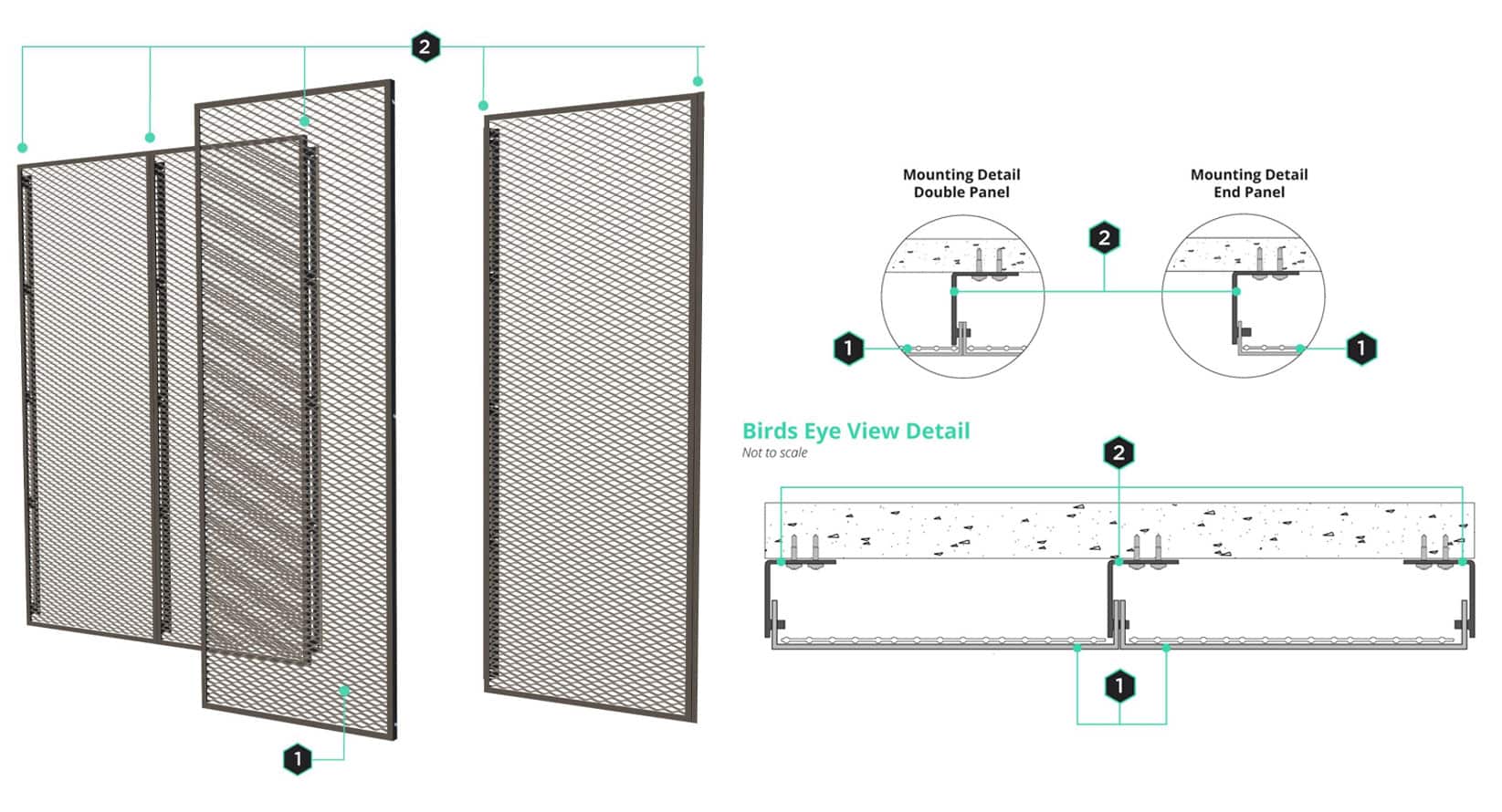The AW100 is a bespoke framed metal panel system that allows designers to incorporate custom metal mesh and profiled designs across a full palette of finishes and textures. Typically manufactured from aluminium or steel, infill panels can be welded into demountable angle frames or folded for a cleaner, more seamless appearance when perforated. Manufactured to suit each application, the AW100 works well for large-scale wall features as well as smaller elements such as bar fronts, reception areas, corridors, and lift interiors, with the option to integrate lighting for added visual impact.